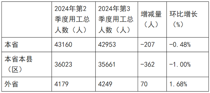 本季度监测企业本省和本省本县(区)员工总人数分别为42953人和35661人,较2024年第2季度分别减少207人和362人,环比下降0.48%和1.00%;外省员工总人数为4249人,较2024年第2季度增加70人,环比增长1.68%。