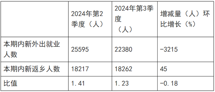 2024年第3季度,湛江市监测的310个行政村共新增外出劳动力22380人,新返乡劳动力18262人,新外出劳动力与返乡劳动力比值为1.23(该值大于1代表劳动力净输出,小于1代表劳动力净回流),较2024年第2季度的1.41减少0.18。从数据看,本季度湛江市农村劳动力输出和回流的差距较2024年第2季度略有下降(见表7)。
