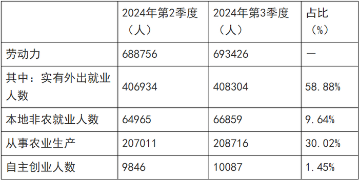 2024年第3季度,湛江市农村劳动力转移就业情况监测的 310个行政村总人口1351290人,共有劳动力693426人,较2024年第2季度的688756人增加4670人