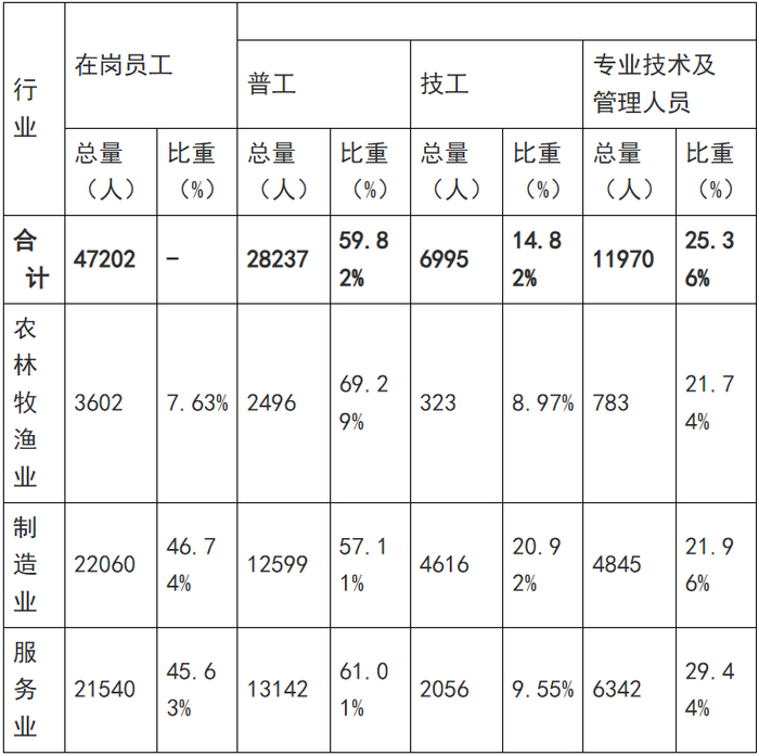 从行业分布看,需求量最大的为制造业和服务业。其中:制造业占比最高,在岗员工总数为22060人 ,占比46.74%;其次为服务业,在岗员工总数为21540人 ,占比45.63%;农、林、牧、渔业在岗员工总数为3602人,占比较少,为 7.63%。
