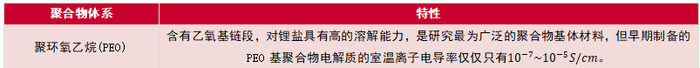 聚合物固态电解质当前技术最成熟、最早实现实际应用。聚合物固态电解质(SPE),由聚合物基体(如聚酯、聚醚和聚胺等)和锂盐(如LiClO4、LiAsF6、LiPF6等)构成。室温下离子电导率为,65~78℃下离子电导率为。相较于无机固体电解质,具有柔韧性好、质量轻、成本低以及易于加工等优势。SPE工艺与现有锂电池接近,易于大规模量产,技术最成熟,也是最早实现实际应用的固体电解质。然而聚合物电解质室温下离子导电率低、需加热至约60℃以上,较柔软,有锂枝晶穿透造成短路风险,热稳定性有限,耐受电压较低。