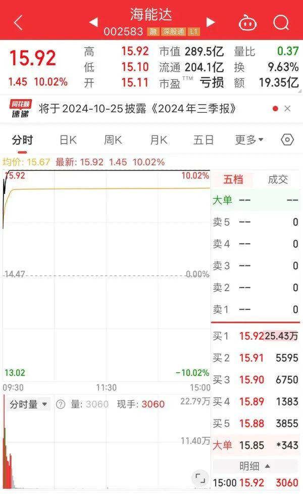 10月23日,海能达再次开盘不久即涨停,当天收盘股价报15.92元/股。值得一提的是,海能达将于10月25日发布三季报,披露具体财务数据。