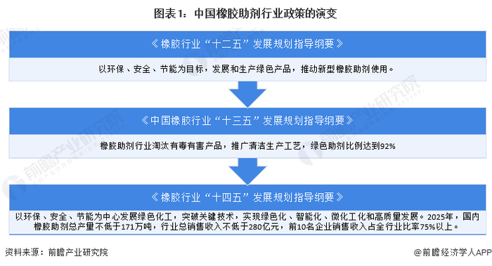“十二五”期间到“十四五”,国家均鼓励发展绿色新型橡胶助剂产品。“十四五”期间,重点实现绿色化、智能化、微化工化发展,到2025年国内橡胶助剂总产量不低于171万吨,行业总销售收入不低于 280亿元,前10名企业销售收入占全行业比率75%以上。