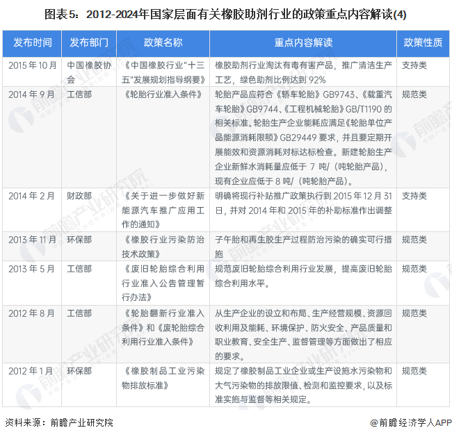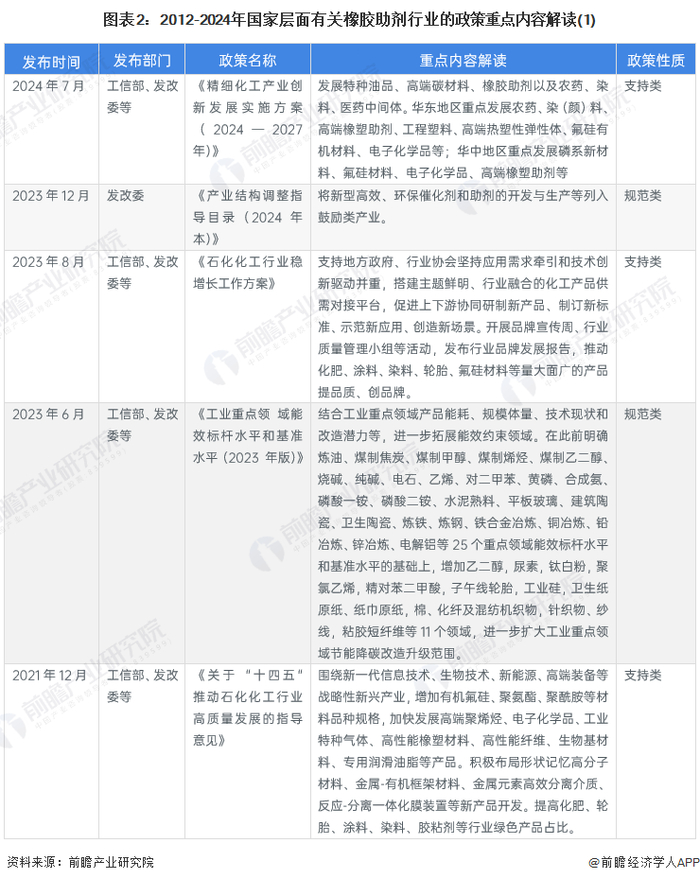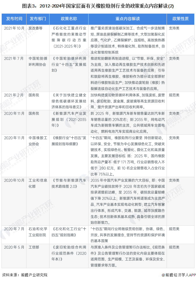 当前,国家主要鼓励发展新型绿色橡胶助剂产品,同时通过支持橡胶助剂下游汽车等领域的发展推动橡胶制剂行业发展。2012-2024年国家层面主要政策汇总如下: