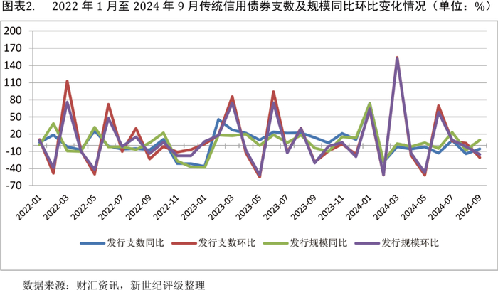 2024年1-9月,传统信用债券共发行11665支,同比下降2.36%;发行规模为10.55万亿元,同比增长4.22%。