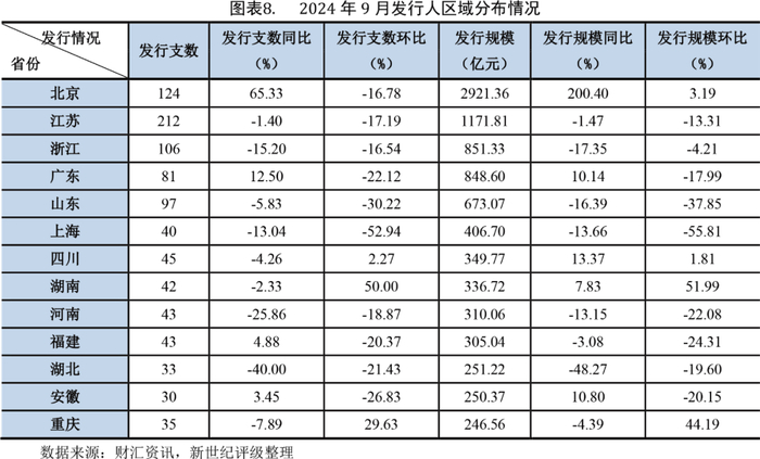 从发行人的区域分布来看,2024年9月发行人来自32个省市自治区,主要分布于北京、江苏、浙江、广东、山东、上海、四川、湖南、河南、福建、湖北、安徽和重庆,上述地区发行支数和发行规模在传统信用债券中合计占比分别为81.95%和83.45%。