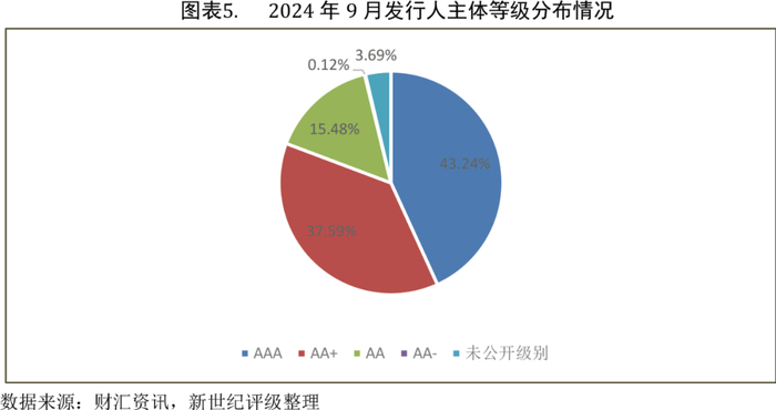 2024年9月,传统信用债券发行人主体信用等级主要包括AAA级、AA+级、AA级、AA-级4个信用等级。AAA级发行主体占比最高,为43.24%。最低级别为AA-级,为私募债发行人,在发行债券时设外部担保。