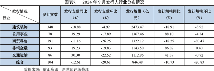 从发行人的行业分布来看,2024年9月发行人涉及29个行业,主要分布于建筑装饰、公用事业、商贸零售、非银金融、交通运输和综合等领域,上述六大行业发行支数和发行规模在传统信用债券中合计占比分别为79.16%和77.29%,行业集中度较高。房地产行业发行人排名第七,发行规模为517.76亿元,环比下降49.87%,同比下降18.34%。