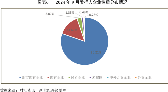 从发行人的企业性质来看,2024年9月发行人主要分布于地方国有企业,在传统信用债券中的比重为80.22%,民营企业占比较低,为3.07%,环比下降1.24个百分点。