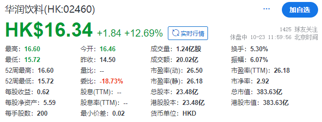 截至发稿时间,华润饮料每股报16.34港元,涨12.69%,总市值约383.63亿港元。