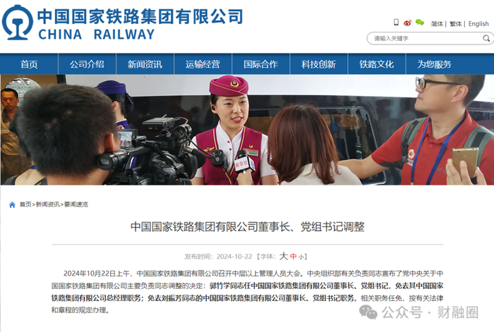 中国国家铁路集团有限公司网站消息,2024年10月22日上午,中国国家铁路集团有限公司召开中层以上管理人员大会。中央组织部有关负责同志宣布了党中央关于中国国家铁路集团有限公司主要负责同志调整的决定:郭竹学同志任中国国家铁路集团有限公司董事长、党组书记,免去其中国国家铁路集团有限公司总经理职务;免去刘振芳同志的中国国家铁路集团有限公司董事长、党组书记职务。相关职务任免,按有关法律和章程的规定办理。
