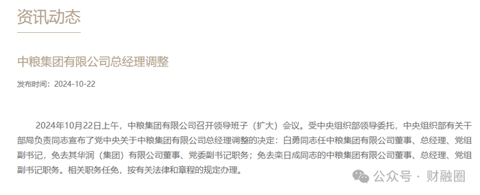 中粮集团网站消息,10月22日上午,中粮集团有限公司召开领导班子(扩大)会议。受中央组织部领导委托,中央组织部有关干部局负责同志宣布了党中央关于中粮集团有限公司总经理调整的决定:白勇同志任中粮集团有限公司董事、总经理、党组副书记,免去其华润(集团)有限公司董事、党委副书记职务;免去栾日成同志的中粮集团有限公司董事、总经理、党组副书记职务。相关职务任免,按有关法律和章程的规定办理。