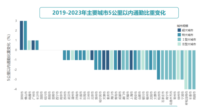 《报告》将5公里以内的通勤距离称为幸福通勤。《报告》显示,2023年5公里以内幸福通勤比重由降转升回到52%,同比提高2个百分点。连续3年幸福通勤全线下降趋势发生转变,42个城市幸福通勤由降转升,其中深圳、广州、长沙、武汉等11个城市已经回归2019年以来的最高水平。