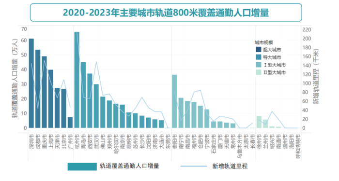 42个运营地铁的城市中,800米轨道覆盖通勤比重总体平均水平为20%,其中,超大城市达到28%、特大城市达到17%。贵阳3号线新增里程43公里,穿心线路串联了城市中心与重要外围组团,带来11个百分点的通勤覆盖提升,是年度增幅最大的城市。