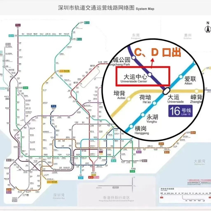 乘坐地铁16号线至大运中心站,C、D出口步行即可抵达深圳大运中心体育场(地铁“大运站”距离场馆有一定距离,不推荐该站点下车)。