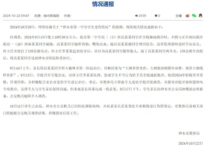 近日,有网友拍视频实名举报称:9月13日,陕西榆林神木市,一中学生受到班主任李某某醉酒殴打,头上多处骨折。该网友表示,孩子需要做开颅手术,到现在都无人问津,呼吁有关部门给孩子一个公道。10月22日,据神木新闻网,神木市教体局就此事发布情况通报,称已对班主任李某某饮酒、惩戒学生不当行为给予其全校通报批评,取消2024年职称晋升资格,停课停职。