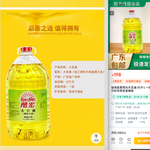 在某电商平台,被查肯德基门店同款转基因大豆油20升售价为198元,在商品详情页标注了“加工原料为转基因大豆”。电商平台截图