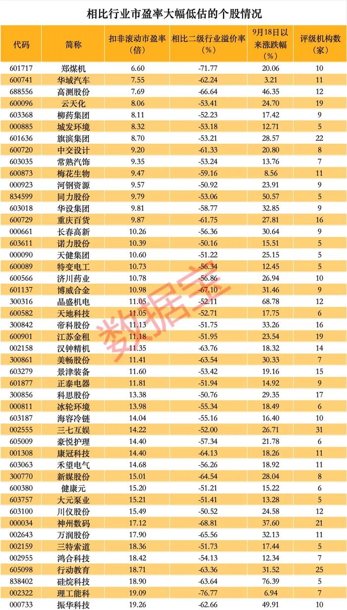 数据宝统计出比行业市盈率低估50%以上的优质股票,未来有望跑赢大盘,筛选条件包括评级机构数在5家以上、扣非滚动市盈率在20倍以下且比相应申万二级行业市盈率(剔除负值)低50%以上的个股,合计有47只股票。