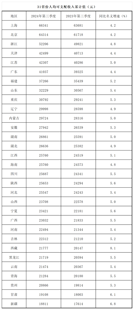 31省份前三季度人均可支配收入数据,透露哪些信息?