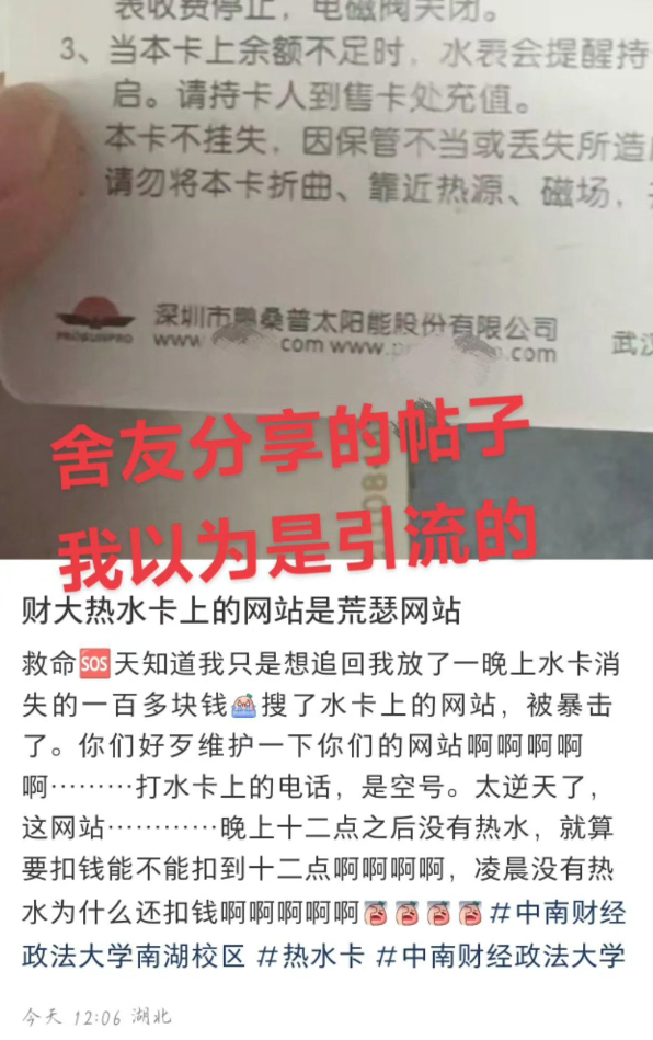 据媒体报道,中南财经政法大学学生公寓服务中心的工作人员在接受采访时表示,他们已经了解到了学生的反馈,并验证了水卡上的网址,确认情况属实。目前,学校已经紧急联系了水卡所属公司的负责人,要求其到校进行商议并解决问题。