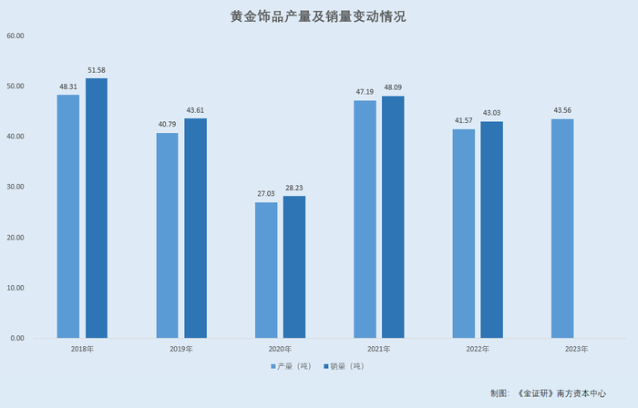 不难看出,梦金园2023年黄金饰品产量低于2018年,其2023年黄金饰品销量未予披露,但其披露的2021及2022年销量均小于2018年的销量。