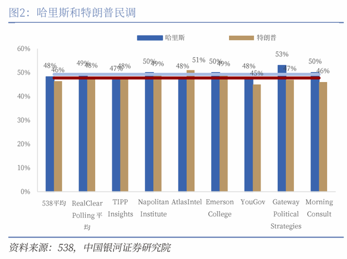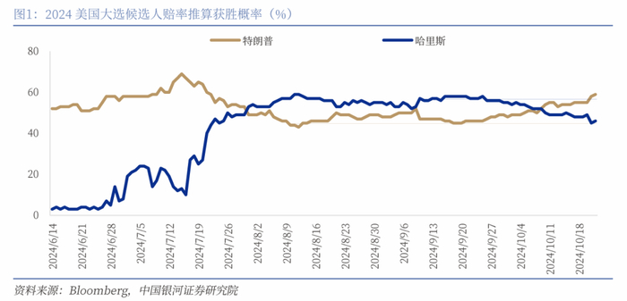 · 特朗普民调赔率翻转。美国大选进入最后冲刺阶段,从9月底开始,一连串的事件反转了特朗普和哈里斯在民调以及竞选博彩赔率上的地位。截至10月22日,特朗普和哈里斯的赔率分别为59% vs 46%,事实上从9月27日开始特朗普的赔率就开始上升,到10月9日超过哈里斯。民调上,虽然整体民调依旧是哈里斯微弱领先,但双方差距在误差范围内,截至10月22日哈里斯和特朗普支持率分别为49.3%和47.7%。但需要注意的是在六个关键摇摆州中,坐拥19张选举人票的宾夕法尼亚州特朗普支持率重新超过哈里斯并获得微弱领先,目前为47.9%vs47.6%,为八月以来首次翻转。同时威斯康辛州作为连续两届投给民主党的摇摆州,特朗普的支持率从最低点44.3%上升至47.6%,与哈里斯的47.9%仅差0.3个百分点。