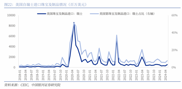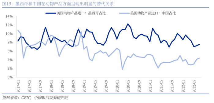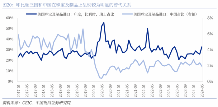 动物产品的替代效应主要来自墨西哥,珠宝及制品的替代效应主要来自印度、比利时和瑞士。对于动物产品,在2019年之前,墨西哥出口和中国出口占美国总进口的比重在6%-10%的区间震荡,且水平较为相近,而2019年之后两者表现分化,墨西哥占比和中国占比拉开差距,且两者后续的走势呈现出较为明显的负相关关系。由此推断,动物产品的替代效应主要来自墨西哥。而对于珠宝及制品而言,中国占比在2019年8月之前一直保持在5%的水平左右,随后占比呈现出一个阶段性的下滑,最后企稳于2%左右的水平。在中国占比下滑的同时,印度、瑞士和比利时的合计占比有一个阶段性的提升,平均水平从26%提升至29%,我们判断对应3%的份额从中国转移至印度、瑞士和比利时三国。