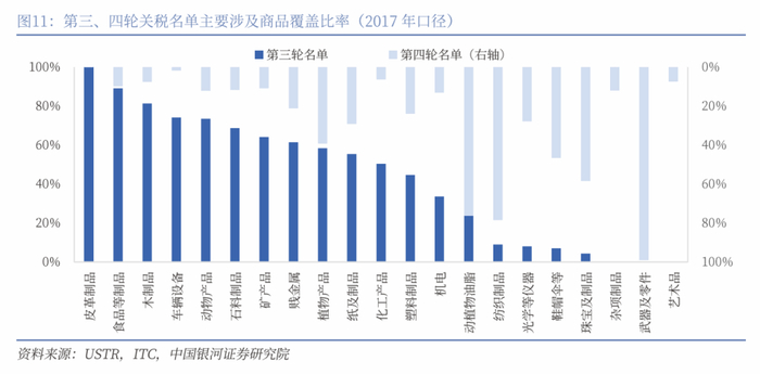 第三、四轮名单涉及了HS分类商品中的绝大多数类别,且呈现出互补的特征。其中第三轮名单于2018年9月生效,初始加征税率为10%,于2019年5月提升至25%;第四轮关税名单于2019年9月实施,加征税率为15%。从商品类别来看,三四轮涉及商品范围广,且覆盖率较高,其中第三轮关税名单集中于皮革制品、食品等制品、木制品、车辆设备,覆盖率依次为100%、89%、81%和74%;而第四轮名单主要侧重于武器及零件、纺织制品、动植物油脂、珠宝及制品,覆盖率依次为99%、78%、76%和58%。从结果上看,三四轮名单的商品呈现出互补的特征。