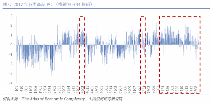 维度二:商品技术水平和类别。首先,从关税加征的内部结构来看,关税更集中于技术水平较高的商品。以2017年美国自中国进口作为衡量口径,其中约有3516亿美元的商品被关税名单覆盖。从内部结构来看,85章(电机、电气设备及其零件;录音机及放声机、电视图像、声音的录制和重放设备及其零件、附件)和84章(核反应堆、锅炉、机器、机械器具及其零件)占比较高,分别为26%和21%。剩余商品占比普遍为5%及其以下的水平。我们利用The Atlas of Economic Complexity的生产复杂性指数(PCI)指标来衡量商品技术水平的高低,PCI衡量了生产一种产品所需的知识量和复杂性,一种商品在制造中需要具备各种知识,包括协调众多高技能人员的知识的程度越高,其PCI指标得分越高。可以看到,在关税结构中主要集中的85、84、94、87、39、73章等商品的PCI均处于较高水平。
