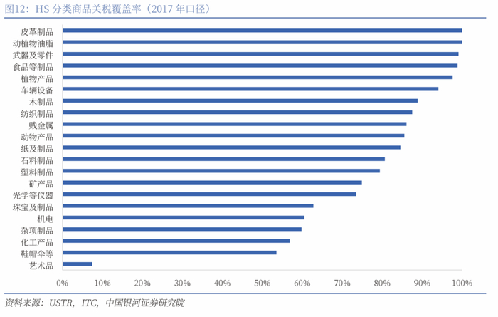以加征关税前(2017年)的口径来看四轮关税的加总效果,HS22类商品中皮革制品、武器及零件、食品等制品、植物产品覆盖率接近100%,商品普遍覆盖率较高。HS22类商品中皮革制品、武器及零件、食品等制品、植物产品类关税覆盖率分别为100%、99%、99%、98%,均接近全部覆盖。除艺术品外,其余各类的关税覆盖率均在50%以上。