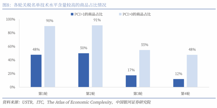 分轮次来看,相较于第三四轮,第一二轮关税名单更集中于技术含量较高的商品。根据上文中PCI的定义,我们以HS4位码为口径统计四轮关税名单中PCI指数大于0和大于1的商品占比,用于衡量每轮关税名单涉及商品的整体技术水平。一个名单中这两类商品占比约高,说明该名单更集中于技术水平较高的产品。从结果来看,第一二轮中PCI大于0的商品占比高达90%,PCI大于1的商品占比也在50%左右,对比之下,第三四轮中PCI大于0的商品占比在50%左右,而PCI大于1的商品占比仅分别为17%和12%。