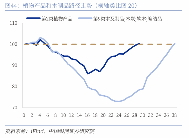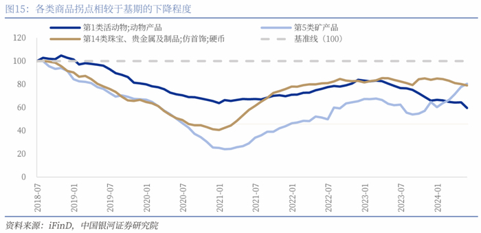 类型一:受关税影响较大且尚未恢复至加税前状态的商品包括动物产品、矿产品、珠宝和贵金属。这三类商品在关税影响下先下行至最低点,后期虽然有所修复但仍未回到加征关税前的水平。