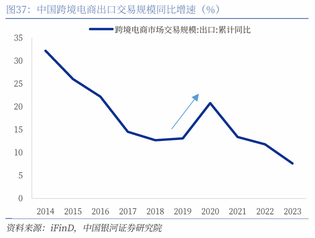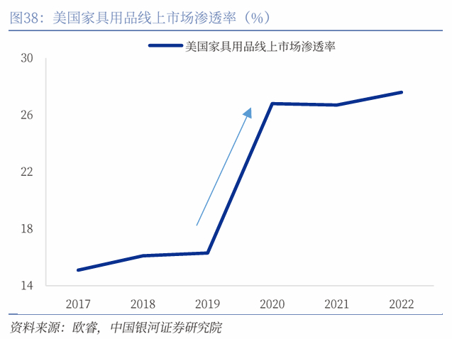 多元化的出口渠道分散单一市场风险和灵活应对全球市场需求变化,从而增强商品出口的抵抗力和恢复力。近年来,我国跨境电商出口规模持续快速提升,2014-2022年期间每年均保持两位数以上的增长速率,对传统制造行业的出口模式产生了深远影响。以玩具为例,近年来各大玩具企业逐步从传统的“货找人”模式向跨境电商新业态模式加大投入,并加速转型。尤其自2020年疫情爆发以来,伴随社交媒体的快速发展,玩具企业积极运用新媒体手段,推动其销售模式的升级与优化,通过在YouTube、Facebook、Instagram以及TikTok等海外社交平台上发布玩具短视频内容,有效引导新媒体流量至相关电商平台,从而显著提升了线上玩具交易的规模,同时,玩具企业还充分利用亚马逊、eBay等电商平台的“无国界”流量优势,迅速崛起并推动跨境电商领域的发展,综上,跨境电商已成为玩具外贸出口的重要渠道之一。同样,家具方面,从购物场景来看,后疫情时代下海外“宅经济”重构并且打破了以往线下购买家具等大件的形态,为线上购买家具奠定了很好的基础;在数字化转型与电商行业发展的背景下,跨境电商成为家具企业出海的新动力,越来越多的电商企业与家具工厂合作,推动产品开发和创新,借由电商平台扩大销售渠道,抢占外海市场。根据大数跨境的《2024全球家具市场洞察报告》家具市场在全球电商市场中占有重要地位,2017年全球家具电商市场规模为1281亿美元,2023达到2360亿美元,CAGR为10.7%。预计到2027年,美国家具电商市场将达到1186亿美元,中国将达到852.8亿美元,而欧洲将达到834.7亿美元,2017-2027年全球家具电商市场收入CAGR预计达10.8%,增长势头较为迅猛;此外,根据Euromonitor测算,家居消费的线上渗透率也在不断提高:美国家居市场线上渗透率在2020年大幅提升至27%,增幅为10.5%,2021年出现短暂退坡后,2022再度提升至27.6%,不断扩张的线上市场为我国家具的跨境电商提供了充足的空间。