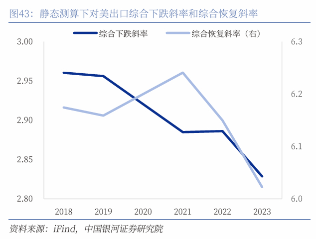 我国对美出口结构调整,静态测算下,对美出口总体上抵抗力有所上升,恢复力有所下滑。在关税的影响下,我国对美出口的商品结构本身有所调整。其中机电占比有较大的下滑,降幅为3.5%,而特殊交易品、杂项制品和塑料制品占比有所上升,分别上升3.2%、1.2%和0.9%。2023年全年,走势为“先下行,后恢复”的十六类商品金额占我国对美出口总额的95%以上,具备良好的代表性,因此我们根据这些商品在上一轮贸易战中的下跌和恢复斜率,以这十六类商品在对美出口总额中的占比为权重,静态测算出2018-2023年我国对美出口的综合下跌斜率和综合恢复斜率。伴随着结构调整,可以看到综合下跌斜率和综合恢复斜率均呈现出下行的趋势,反映出我国对美出口总体抵抗力有所上升,恢复力有所下滑;而2023年综合下跌斜率和综合恢复斜率最终落点依次为2.83和6.02,分别与植物产品和木制品最接近,因此这两类商品的下跌/恢复路径或值得参考。