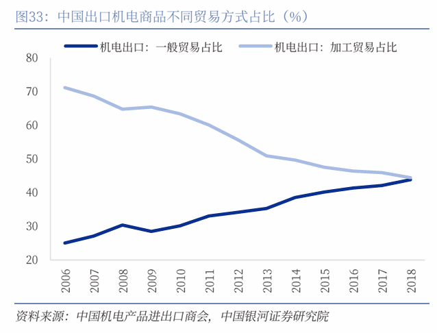 机电:结构升级增强抵抗韧性,外需较弱拖延恢复过程。机电在关税影响下呈现出较为良好的抵抗韧性,主要受到产品出口结构升级的提振。根据中国机电产品进出口商会的数据,2006年以加工贸易方式出口机电产品3912亿美元、占比高达71%,以一般贸易方式出口机电产品1375亿美元、占比仅有25%;而随着机电企业资本、技术的积累加上政府政策对机电产业的支撑和扶持,使得越来越多竞争力强的机电企业拥有了自主知识产权和自有品牌,技术密集型一般贸易企业发展迅速,低端制造的厂商逐步转为定点生产厂商等出口模式,一般贸易占比持续上升的态势,2018年,以一般贸易方式和以加工贸易方式出口的机电产品货值相当,扭转了出口机电产品以加工贸易为特征的贸易格局,中国机电产业对外贸易结构优化和转型升级成效显著。从后续恢复来看,外需较弱拖延恢复过程。我国机电产品在全球范围内具有明显的产能规模优势,国际市场需求波动是影响我国机电外贸兴衰的主因,机电的恢复期处于2020年3月-2021年2月,在此期间,美国对于机电产品需求整体较为疲软,标准化数据处理后,可以看到美国对于机电的进口需求处于加征关税以来的最低水平。此外,机电产品进口需求也会受到制造业经营活动水平的影响,美国ISM制造业PMI小幅领先于机电进口同比增速,而ISM制造业PMI自2018年8月后便呈现出下行趋势,于2020年4月录得41.5%,为2018年以来的最低值。