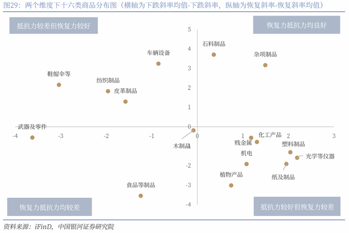 根据抵抗力和恢复力两个维度,我们绘制了两个维度下的十六类商品分布图,并选取纺织制品、机电和杂项制品这三类具备代表性的商品进行具体分析。为了更好评估上述分析的十六类商品抵抗力和恢复力的相对强弱,我们以下跌斜率均值-各类商品下跌斜率为横轴来衡量商品的相对抵抗力,以各类商品的恢复斜率-恢复斜率均值来衡量商品的相对恢复力,绘制两个维度下十六类商品分布图,第一至四象限分别代表:恢复力抵抗力均良好,抵抗力较差但恢复力较好,恢复力抵抗力均较差,抵抗力较好但恢复力较差。具体来看,较多数商品均分布在第二、四象限。我们从第一、二和四象限分别选取第20类商品(杂项制品,主要包括玩具和家具)、第11类(纺织原料及纺织制品)和第16类(机电、音像设备及其零件、附件)进行具体分析。