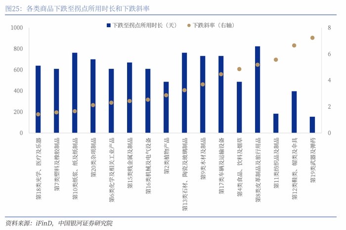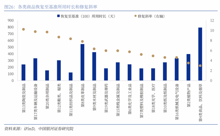 从下跌斜率和恢复斜率来看,光学等仪器、塑料制品、纸及制品抵抗力较强,而石料制品、车辆设备、杂项制品恢复力较强。我们用下降程度/下跌至拐点所用时长*100来衡量不同商品的下跌斜率,用下降程度/恢复至基准所用时间*100来衡量不同商品的恢复斜率。斜率的计算综合考量了受影响程度和时间两个维度,可以用于衡量商品出口在关税影响下的抵抗力(下跌斜率越低抵抗力越强)和恢复力(恢复斜率越高恢复力越强)。可以看到,抵抗力较强的商品有第光学等仪器、塑料制品、纸及制品,而恢复力较强的商品有石料制品、车辆设备、杂项制品。