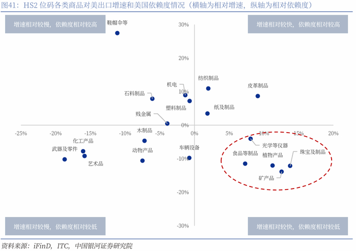 根据上文总结的规律,光学等仪器、植物产品、食品等制品、珠宝及制品、矿产品和动植物油脂更有可能被新一轮关税针对,且关税覆盖率会相对更高。我们在上文总结出的两条关于上一轮关税加征的规律:(1)关税主要涉及前期增速相对较快的商品,关税实施后,四轮涉及商品增速和占比均下滑。(2)美国对华依赖度较高的商品,其关税覆盖率普遍更低。由此可以推断出,在所有商品中,增速较快的商品更可能被新一轮关税针对,而美国对华依赖度相对较低的商品则更可能会在更大程度上被关税覆盖。我们用HS2位数口径下各类商品2023年对美出口增速减去我国2023年对美总出口的同比增速(2023年我国对美出口同比下降14.1%),用来衡量各类商品对美出口的相对增速;用各类商品2023年美国对华依赖度减去2023年美国对华进口的总依赖度(2023年美国对华进口除以美国总进口,约占14%),用来衡量各类商品的相对依赖度。通过绘制两个维度下各类商品的分布图,可以看到光学等仪器、植物产品、食品等制品、珠宝及制品、矿产品和动植物油脂这几类商品属于增速相对较快、依赖度相对较低的范畴。(注:其中动植物油脂未绘制在图中,该类商品2023年对美出口增速为421%,依赖度为5%。)