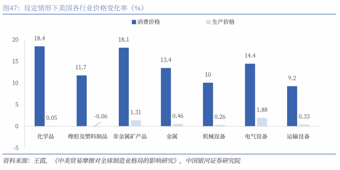 分行业来看,Bouët和Laborde(2018)对不同增税情景的比较分析表明,加征关税整体上对美国产业发展不利,尽管少数行业可能从中获益,但美国的化工、橡胶和塑料制品、农业、肉类和奶制品、机动车及零件、运输设备等行业将面临负面冲击。王霞(2019)对中美贸易摩擦的经济效应进行测算和模拟,结果表明,在中国的反制措施影响下,美国橡胶及塑料制品、非金属矿产品、金属及电气设备等行业的出口降幅甚至超过中国,如果进一步考虑区域全面经济伙伴关系协定(RCEP)与中国关税反制措施的双重影响,美国各行业的出口降幅将进一步扩大。当设定情形为RCEP深度实施、美国单方面加征25%时,美国各行业的生产价格普遍有小幅提升,而消费价格基本上有接近10%的涨幅,对美国生产者和消费者福利有一定的负面影响,进而会影响美国相应行业的产出。而本次特朗普提出的加征60%关税措施相较于该设定情形更为极端,因此对美国各行业产生的负面影响预计也会更大。