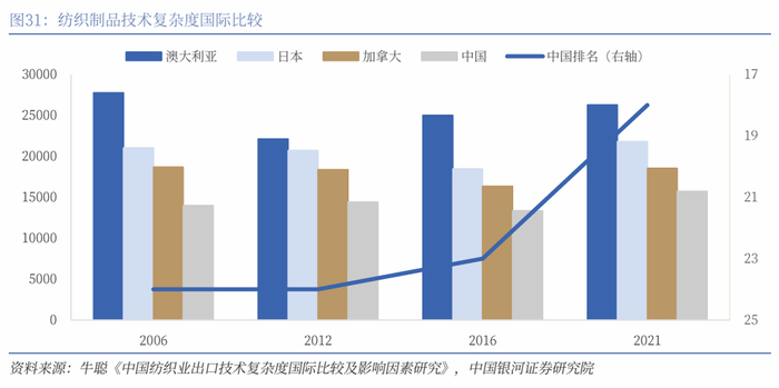 纺织制品:成本抬升和技术水平较低导致抵抗较弱。第11类纺织品是劳动密集型产品,我国出口此类产品的主要优势来自我国的劳动力更为充沛且成本相对较低,在低成本的基础上价格更为实惠,商品也因此更具吸引力。而加征关税往往会提升商品的价格水平,关税会使企业经营成本增加,由于纺织行业原本的利润率本就微薄,这样在原有出口价格水平下,企业无力承担关税费用,只有通过上涨出口价格来承担关税。2019年9月,纺织制品被第四轮关税大幅度覆盖后,其出口价格指数骤升至2018-2021年内的最高水平。除此之外,我国在第11类商品上除了低价外并无其他明显优势,从技术水平的视角来看,牛聪(2023)根据Hausmann et al.(2007)出口技术复杂度的测算方法计算世界主要纺织出口国的纺织品技术复杂度,可以看到我国第11类商品的技术复杂度显著低于海外发达国家,例如澳大利亚、日本和加拿大。2008、2012、2016、2021这四年我国的纺织业出口技术复杂度排名分别为24、24、23、18,虽有进步但对比其他国家或地区不算高,位次排名常年处于下游。