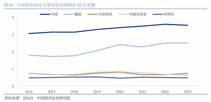 杂项制品:抵抗和恢复得益于断层优势。杂项制品主要包含玩具和家具,和前文分析的纺织制品同属于劳动密集型产品。以RCA作为衡量标准,相较于纺织制品,杂项制品的优势更为明显,RCA指数稳定保持在3以上,远超其他东南亚国家。