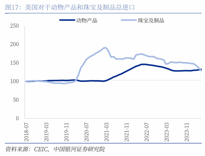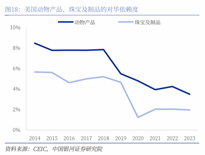 对于动物产品和珠宝及制品,更多的是替代效应在主导。我们将美国对第1类(动物产品)和第14类(珠宝和贵金属等)的总进口额进行同样的处理,可以看到美国对于这两类商品的需求并未有过疲软的表现,由此可以排除需求因素影响的可能。同时,两者的美国对华依赖度在2018年后都存在一个阶段性的下滑,由此可以判断这两类商品主要是受替代效应的影响。