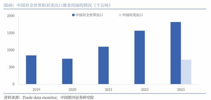 动植物油脂对美出口2023年的快速增长是由于政策刺激和需求转移。图39中可以看到,第三类商品在进入2023年后进入快速上行时期。2022年8月起,拜登政府通过《通货膨胀削减法案》(IRA)以推广清洁能源,IRA为环保航空燃料(SAF)提供税负优惠,并延长对生物柴油的奖励措施。在此项政策的刺激下,海关数据显示,2023年1-8月,中国出口至美国的废食用油(UCO)总量接近384,000公吨,而根据船舶追踪公司Kpler的数据,这一数字占美国截至8月进口量的65%。此外,2023年中期,中国废食用油进口量的大幅增长与德国要求欧盟调查来自中国的生物燃料进口(这些生物燃料被标记为由废油制成)的时间相对应。欧盟也为废油制成的生物燃料提供激励措施,德国则对进口生物燃料的真实性提出了担忧并申请调查。与2022年相比,2023年欧洲从中国进口的废油减少了约60万公吨,而美国的进口量增加了70多万公吨。根据Trade data monitor的数据,中国在2022年前对美国出口UCO的数量几乎为零,而2023年全年暴涨至71.8万公吨,约占据中国UCO总出口的40%。