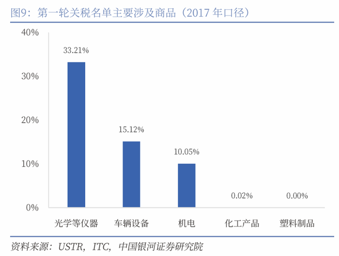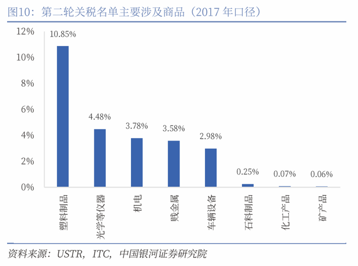 从四轮商品加征关税的顺序中可以看到,加征关税前期集中在高附加值和技术含量较高、对美国经济和产业安全具有较大影响的产品(如光学、医疗仪器,机电设备和车辆),随后逐步延伸到基础材料和中间产品(如塑料、橡胶、木材及纺织品),最后更多地针对消费品(如珠宝、纺织品和动植物油脂)。