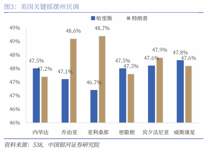 截至10月22日,特朗普和哈里斯的赔率分别为59% vs 46%,事实上从9月27日开始特朗普的赔率就开始上升,到10月9日超过哈里斯。民调上,虽然整体民调依旧是哈里斯微弱领先,但双方差距在误差范围内,截至10月22日哈里斯和特朗普支持率分别为49.3%和47.7%。但需要注意的是在六个关键摇摆州中,坐拥19张选举人票的宾夕法尼亚州特朗普支持率重新超过哈里斯并获得微弱领先,目前为47.9%vs47.6%,为八月以来首次翻转。同时威斯康辛州作为连续两届投给民主党的摇摆州,特朗普的支持率从最低点44.3%上升至47.6%,与哈里斯的47.9%仅差0.3个百分点。