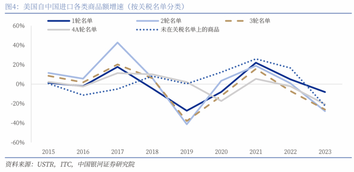 维度一:商品出口增速。从商品出口增速来看,四轮关税主要涉及前期增速相对较快的商品;关税实施后,四轮涉及商品增速和占比均下滑。通过拆解美国2018-2019年四轮关税的细分产品名单(HS10位码口径),可以获得不同名单和未在名单上的商品在不同年份的美国自中国进口额。从增速表现上来看,可以看到在加征关税前,2015-2017年关税涉及的商品增速均高于未在关税名单上的商品。2018年7月-9月,前三批加征关税政策落地,前三轮名单商品2019年同比增速普遍下滑30%-40%;第四批名单于2019年9月落地,对2019年增速影响较低,2020年增速则出现较大幅度的下滑,为17%。在加征关税后,2020-2022年,四轮名单上的商品增速表现持续弱于未在关税名单上的商品。从占比来看,关税覆盖商品占美国自中国进口总额的比重呈现出持续下跌的走势,从2017年的67%下行至2023年的46%。