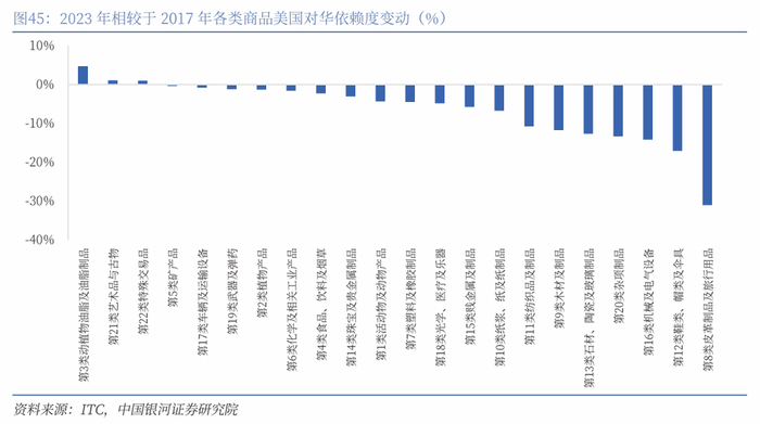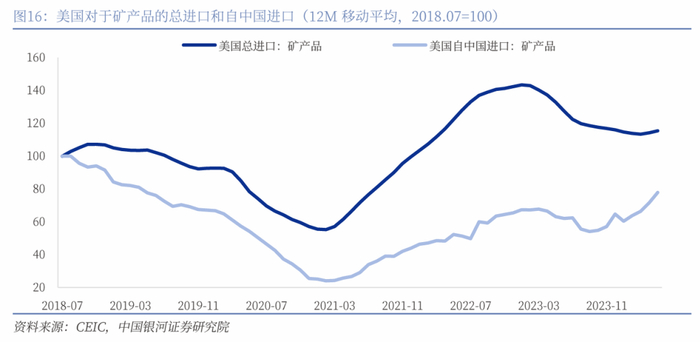 替代效应是导致这三类商品出口受挫后并未恢复到原始状态的最主要因素。对于第5类商品(矿产品)来讲,美国的对华依赖度处于极低的水平,从2018年的0.6%逐步下降至2023年的0.2%,而在依赖度较低的情况下,进口需求疲软主导了矿产品出口表现的下降。我们以美国对于矿产品的总进口来衡量美国市场对于此类商品的外贸总需求,可以看到在拐点之前,美国对于矿产品的总进口和自中国进口的走势十分相似,其相关系数高达0.96。在拐点之后,两者之间的差距逐渐走扩,美国自中国进口的走势并未跟上总需求的步伐恢复至初始状态,但两者的走势仍表现出了一定的相似性。可以看出总需求的回暖也对我国矿产品的出口起到了一定的带动作用,而拐点之后两者走势变阔更多的是由于其他供给市场的替代作用,不到1%的依赖度已经在一定程度上反映出我国在该类商品出口方面不具备优势,而加征关税的影响下,产品竞争力的相对衰弱也给了其他供给市场可乘之机。