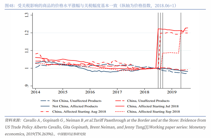 部门方面,从居民部门来看,Cavallo、Gopinath等(2019)的研究基于劳工统计局的中国进口商品价格数据,发现关税上升带来的成本几乎完全由美国进口商承担,加征关税前,来自中国的产品跨境价格几乎没有变化,而关税加征后,进口价格的上涨与关税幅度基本一致。部分关税负担由此转嫁给了美国居民,如果本次美国加征60%的关税(提升幅度约为40%),则美国各类商品的进口价格预计也会有相应的增长,从而大幅增加美国居民的生活负担。此外,就业方面,《纽约时报》于今年8月的报道指出,尽管美国两届政府均表示征收关税旨在促进制造业岗位回流美国,但实际情况表明,即便关税迫使制造商和零售商减少对中国的依赖,生产通常只是转移至墨西哥、越南或印度等其他低成本国家。
