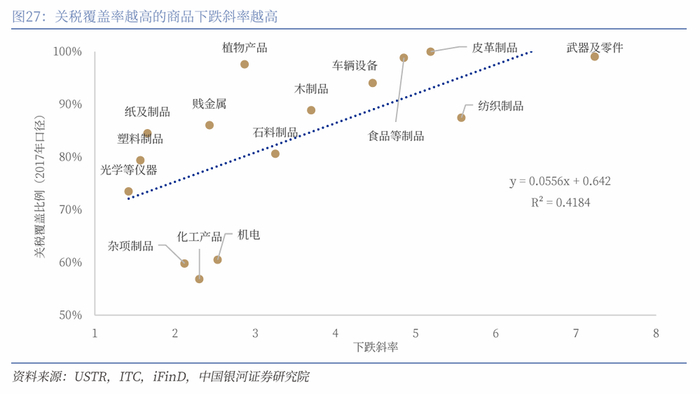 维度三:产品的依赖度。从商品依赖度来看,美国对华依赖度较高的商品关税覆盖率普遍更低。我们以每类商品美国自中国进口量/美国自世界进口量来衡量商品依赖度。2017年HS22类商品中,杂项制品、鞋帽伞等、皮革制品、机电美国对华依赖度较高,依次为61%、59%、54%和37%。通过绘制1-20类商品(美国主要加征关税的商品类别)对华依赖度和关税覆盖率的散点图,可以发现两个指标存在较为明显的负相关关系。