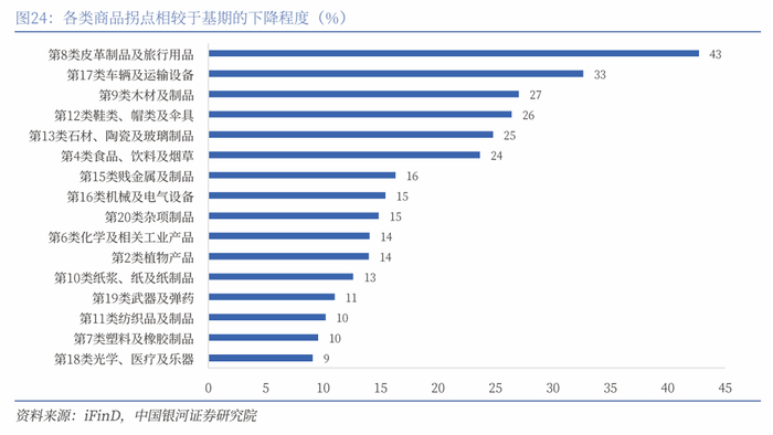 从影响程度来看,皮革制品、车辆设备、木制品、鞋帽伞等类商品下降程度较大。我们将V型走势中的最低点(拐点)和基期进行比较,可以看到皮革制品、车辆设备、木制品、鞋帽伞、石料制品及食品等制品类受关税影响较大,其降幅依次为43%、33%、27%、26%、25%和24%。
